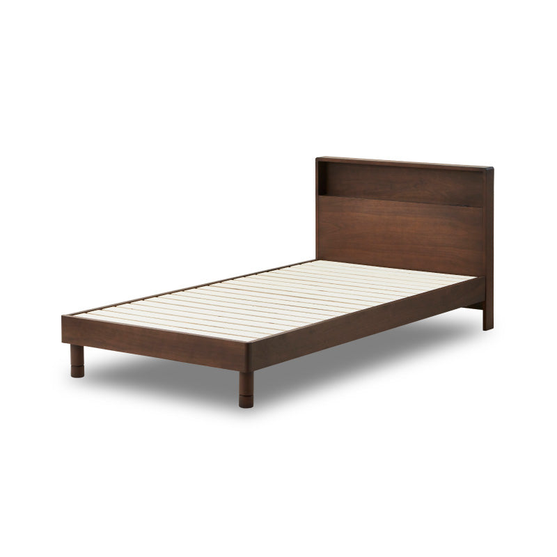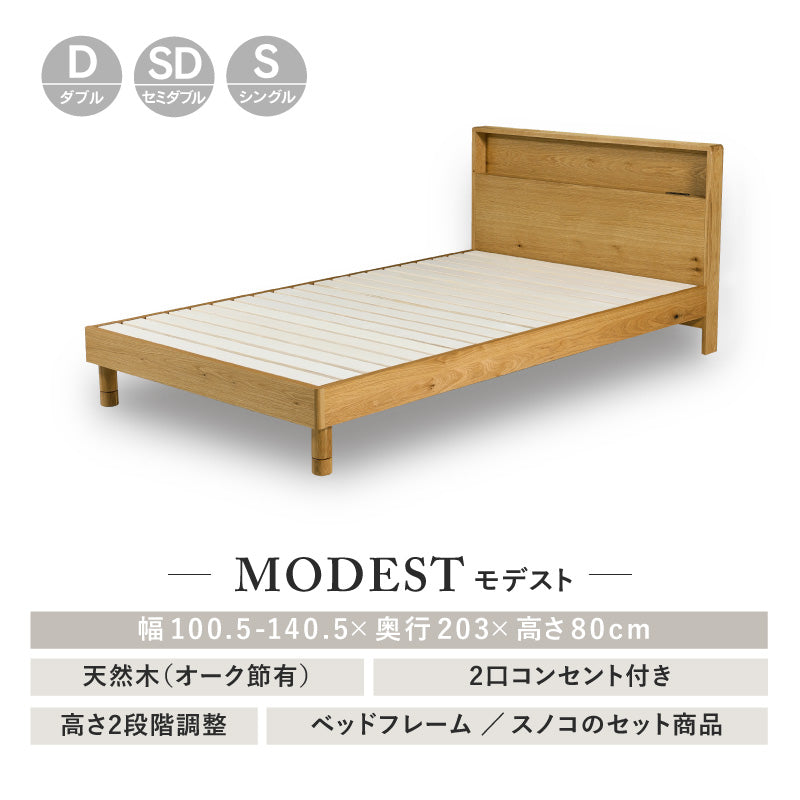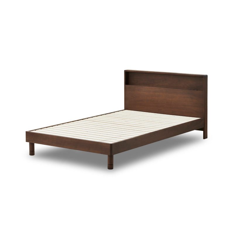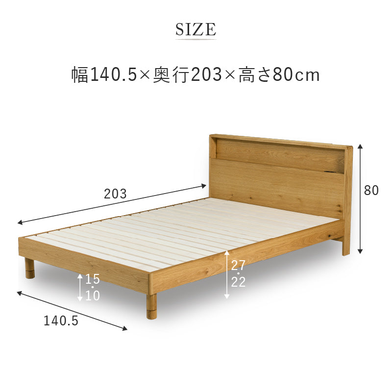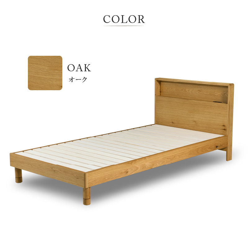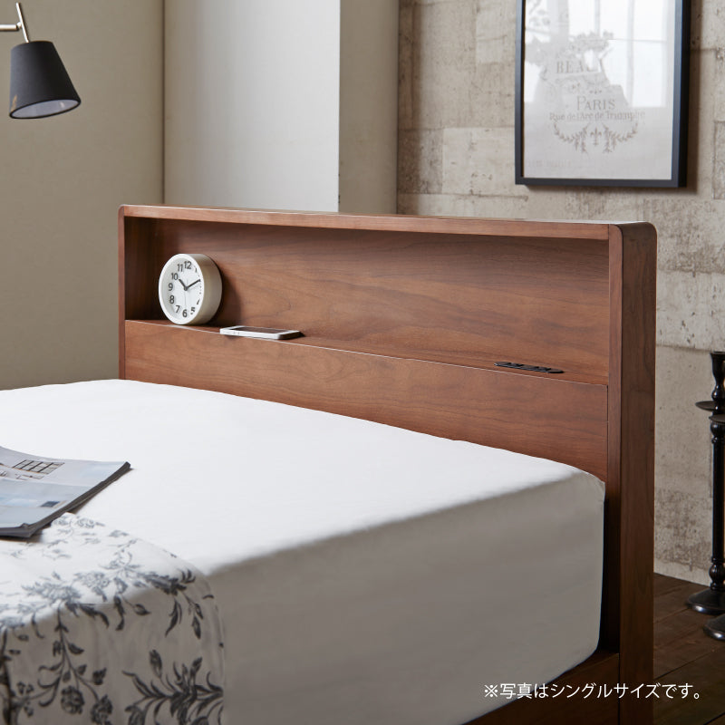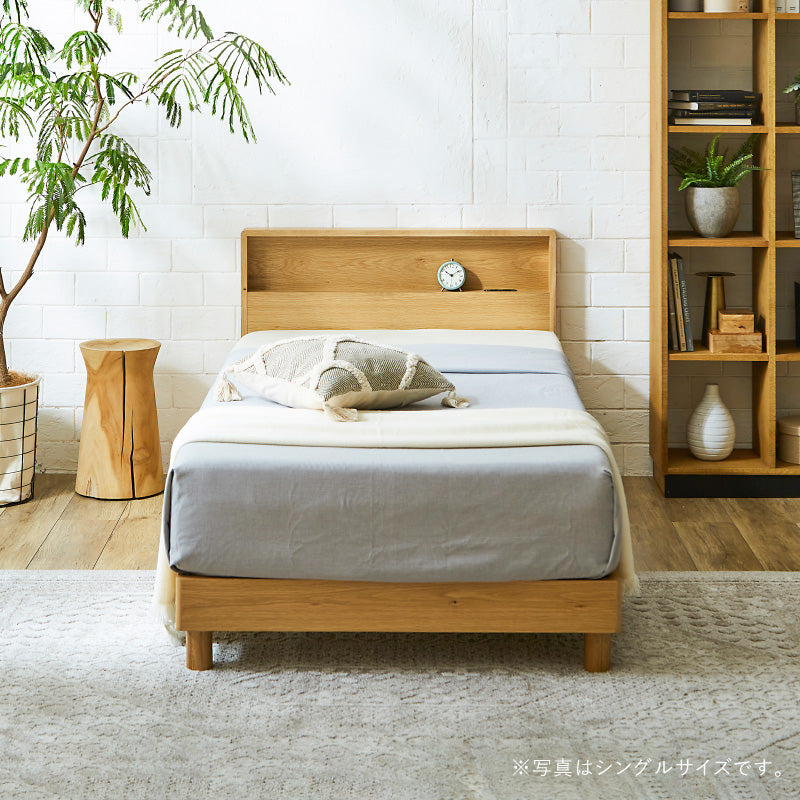 商品情報 お使いのマットレスに合わせて、床面高は2段階調節ができる、すっきりとしたデザインでありながらも、機能性を備えたベッドフレームです。 ヘッドボードには時計などを置ける奥行6.5cmのスペースがあり、携帯電話の充電に便利な2口コンセントがついています。 ヘッドボード上部は無垢材を仕様しているため、美しい木目がよりあたたかい空間を演出してくれます。