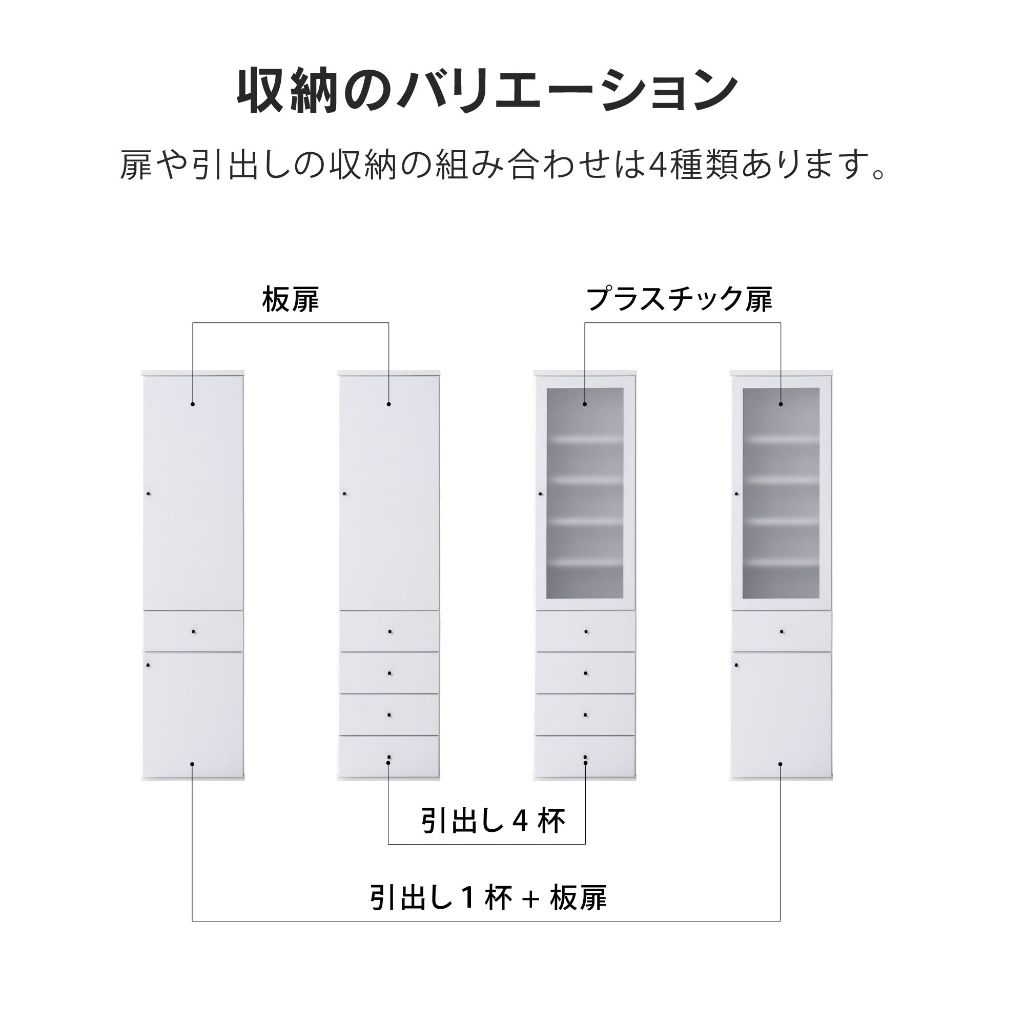 商品情報 キッチンや洗面所、リビングなどの狭い場所を有効利用できます。20㎝から45c㎝の間で2.5c㎝単位でお好みの幅をお選びいただけます。たっぷり収納できる引出4杯付き。