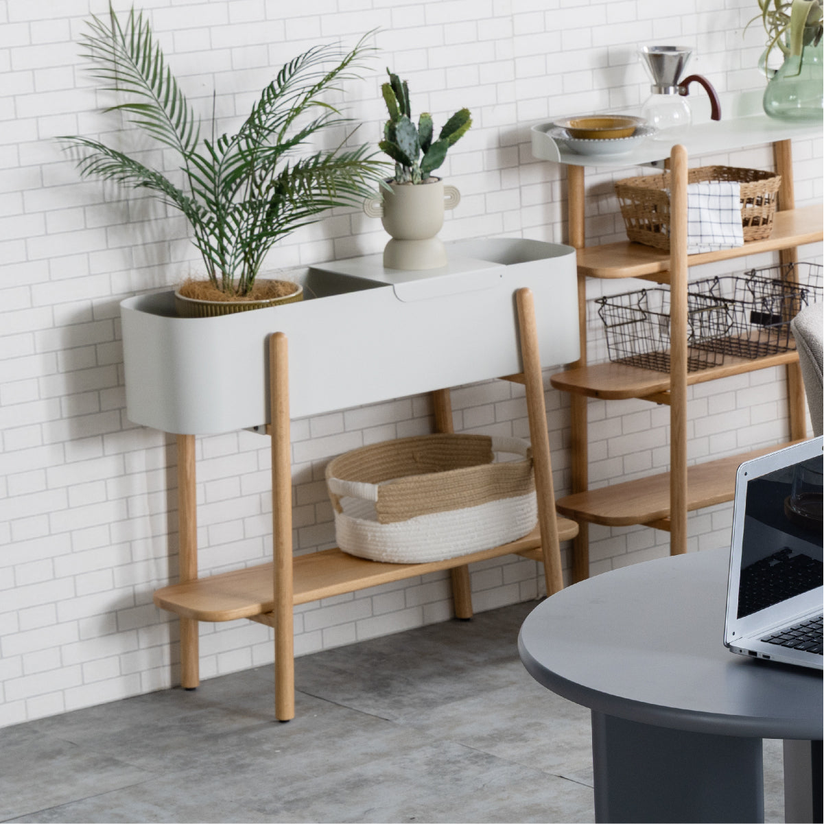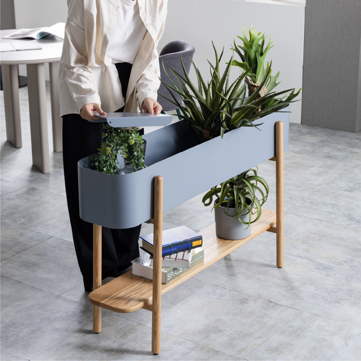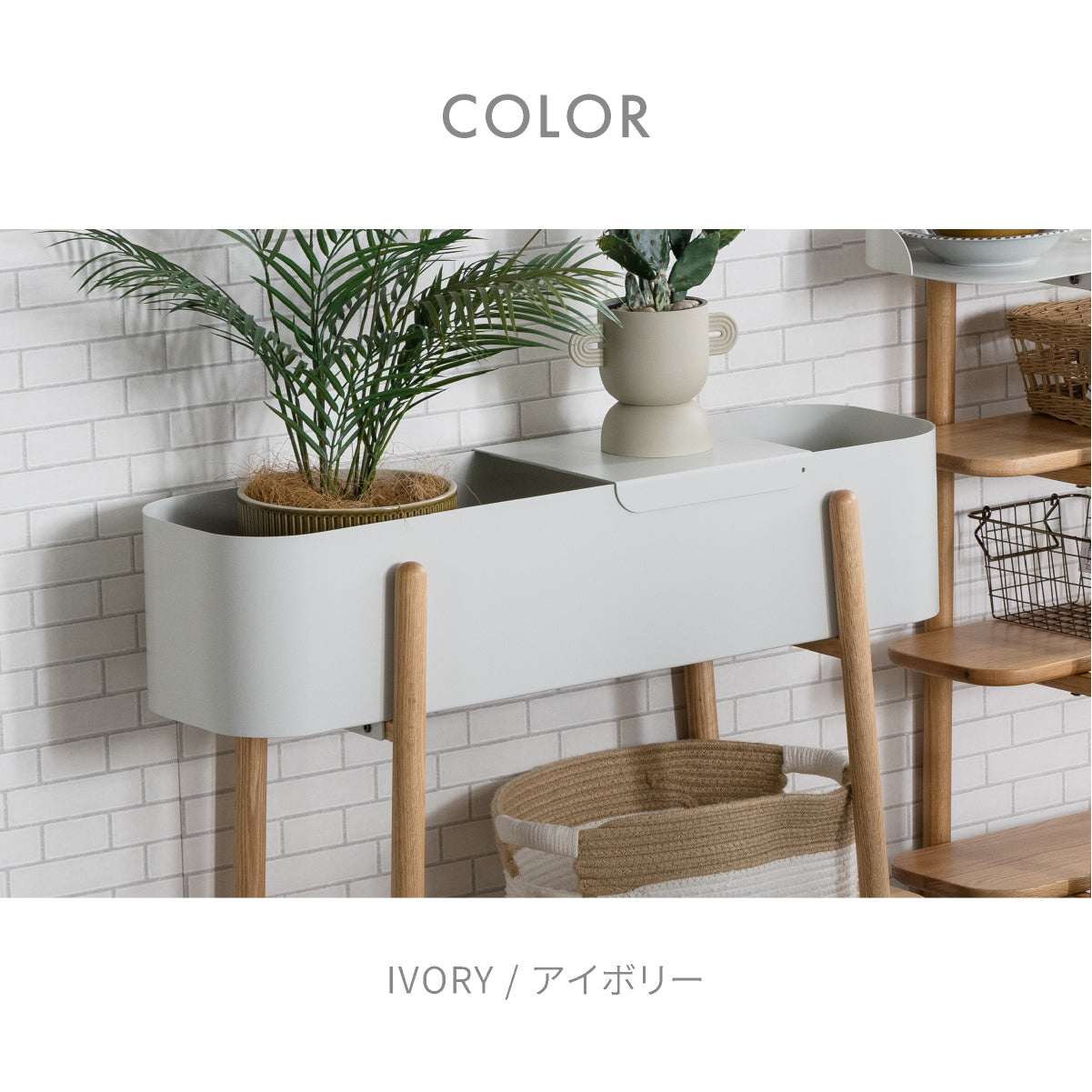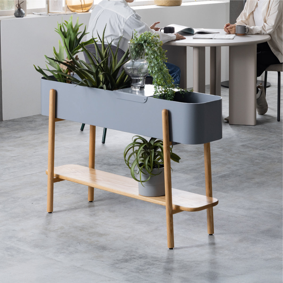 商品情報 丸みのあるアイアンのボックスとオーク無垢材を使用した脚部が特徴のプランター。 飲食店やフードコート、カフェ、オフィスなどにぴったりな、コーディネートしやすいデザインです。 テーブルと通路など、スペースを仕切るのに、単体でも連接でも便利に使えます。フタ付きなので、高さを出したディスプレイ方法も可能です。