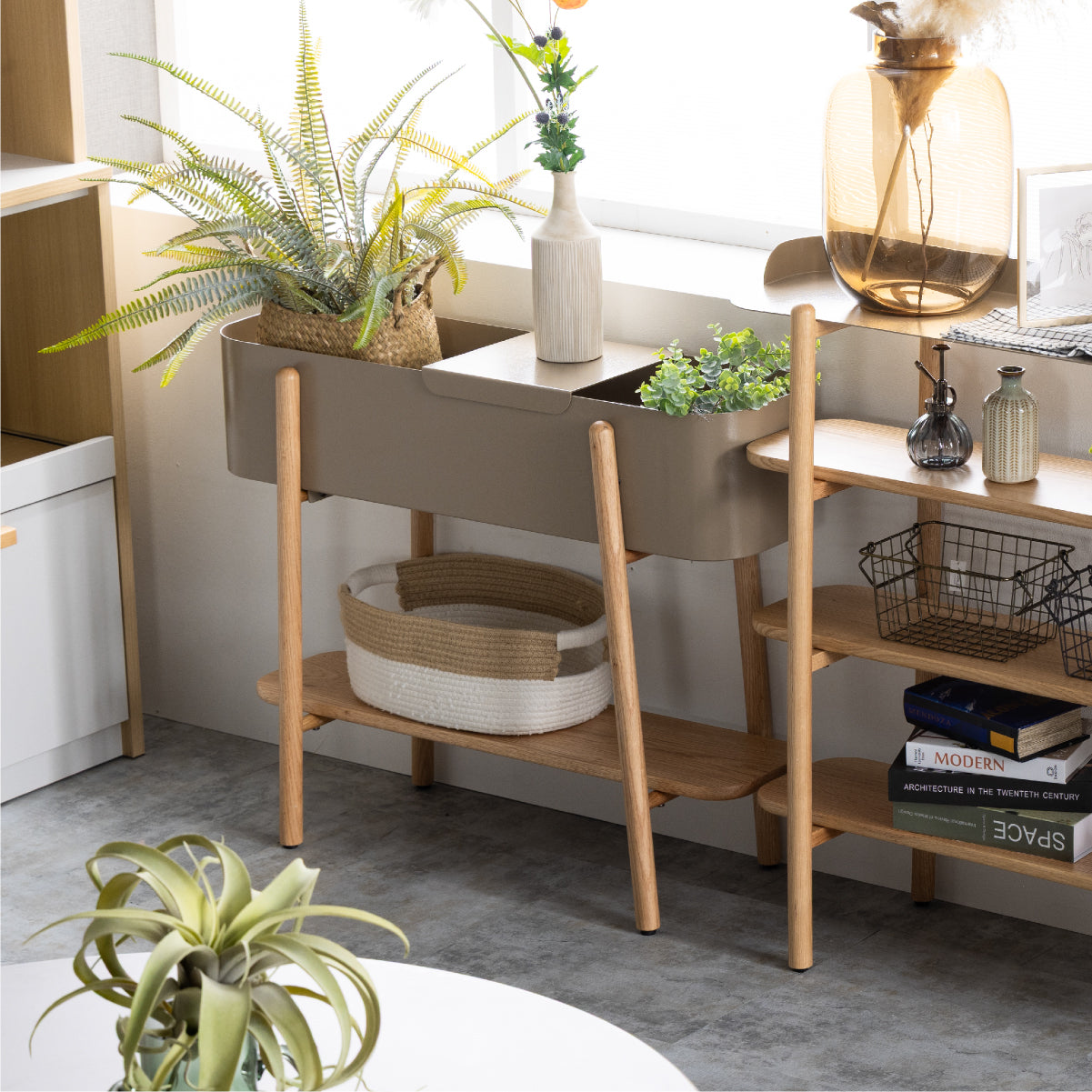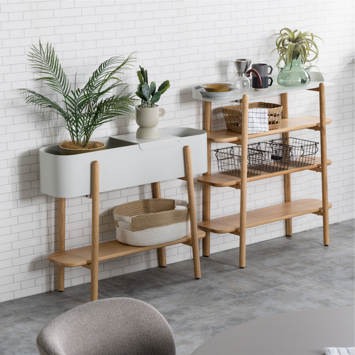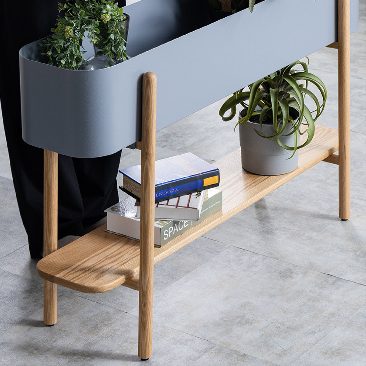 商品情報 丸みのあるアイアンのボックスとオーク無垢材を使用した脚部が特徴のプランター。 飲食店やフードコート、カフェ、オフィスなどにぴったりな、コーディネートしやすいデザインです。 テーブルと通路など、スペースを仕切るのに、単体でも連接でも便利に使えます。フタ付きなので、高さを出したディスプレイ方法も可能です。