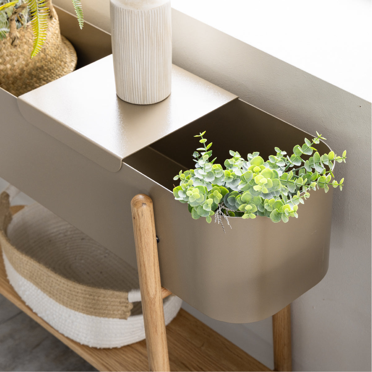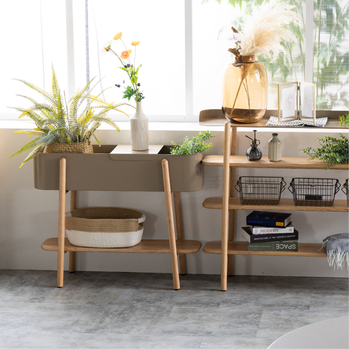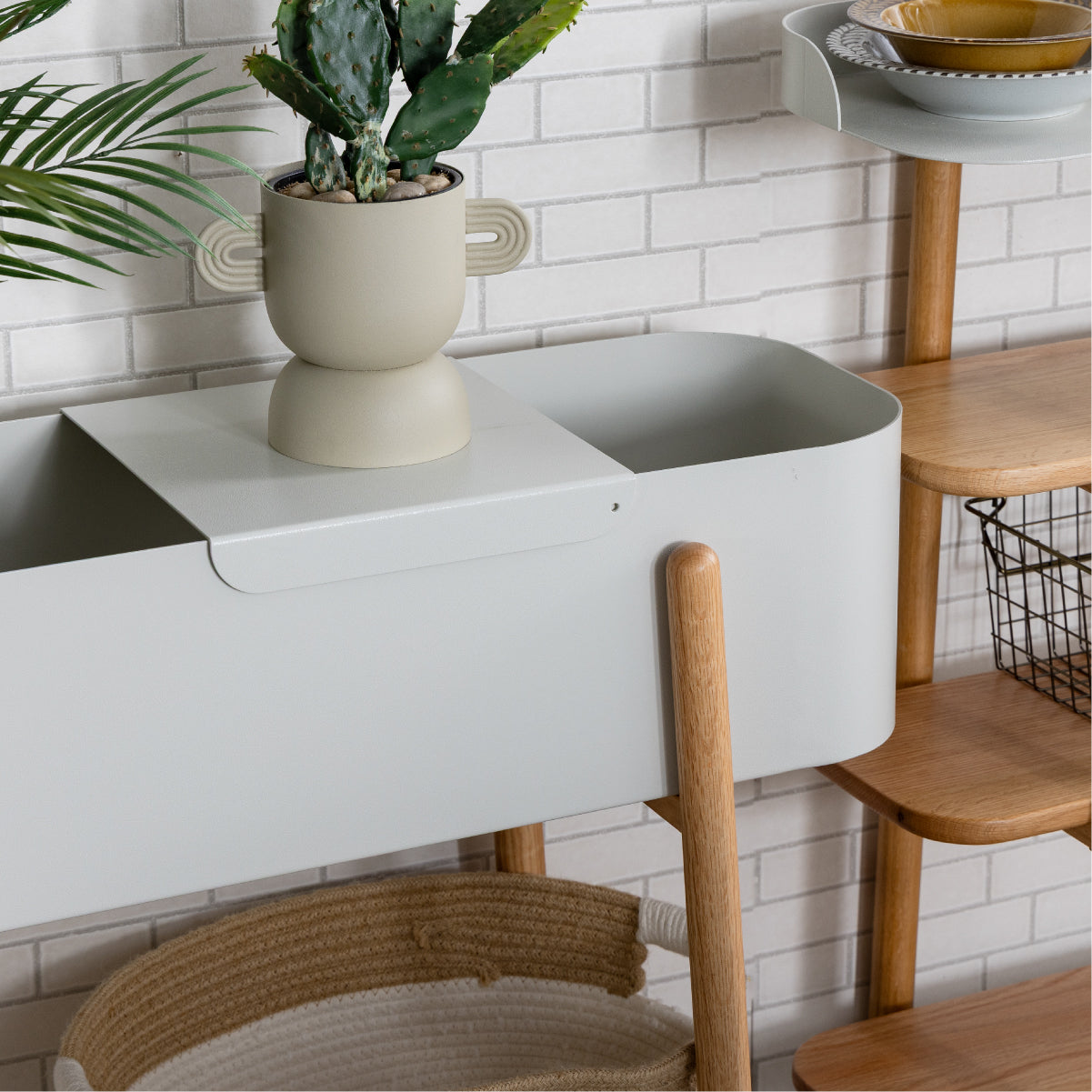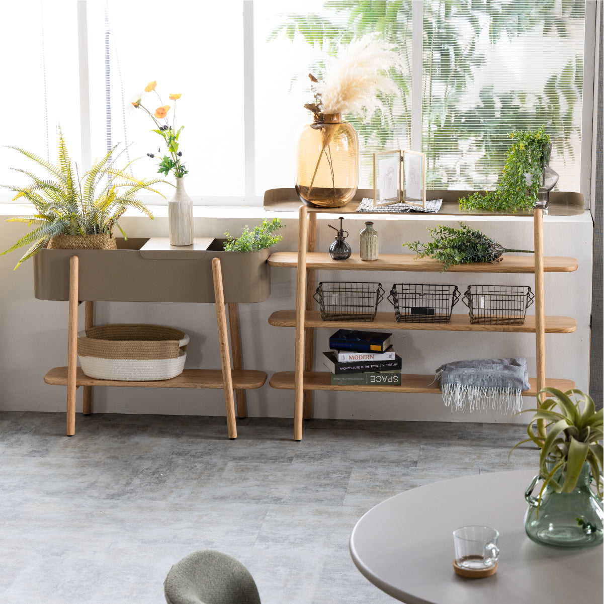 商品情報 丸みのあるアイアンのボックスとオーク無垢材を使用した脚部が特徴のプランター。 飲食店やフードコート、カフェ、オフィスなどにぴったりな、コーディネートしやすいデザインです。 テーブルと通路など、スペースを仕切るのに、単体でも連接でも便利に使えます。フタ付きなので、高さを出したディスプレイ方法も可能です。
