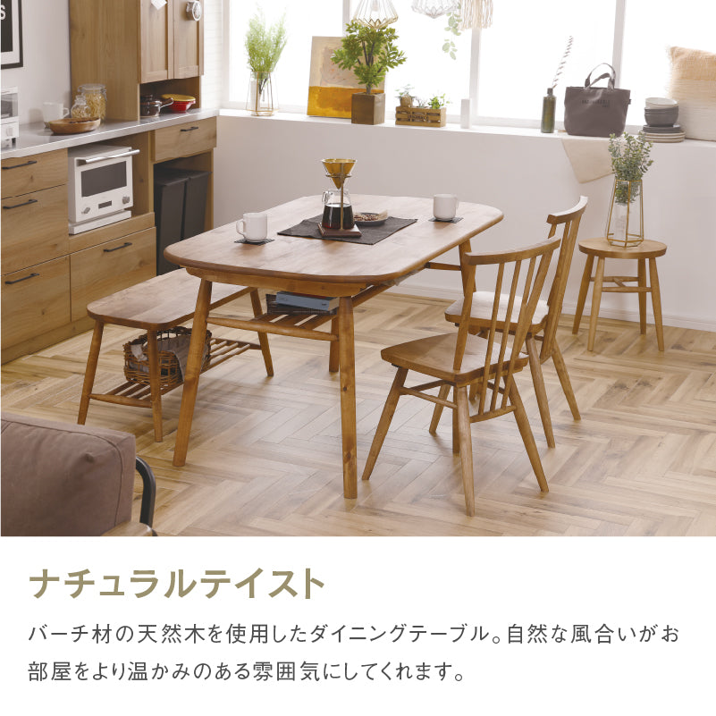 商品情報 バーチ材天然木を使用したナチュラルテイストなダイニングテーブルです。天板は角のない優しい丸みを帯びた長方形のため、小さなお子様にも安心してお使い頂けます。天板下には棚が付いているので、ティッシュやリモコンをさっと仕舞うのにとても便利です。幅140㎝で4人で使用するのにちょうどいいサイズ感です。