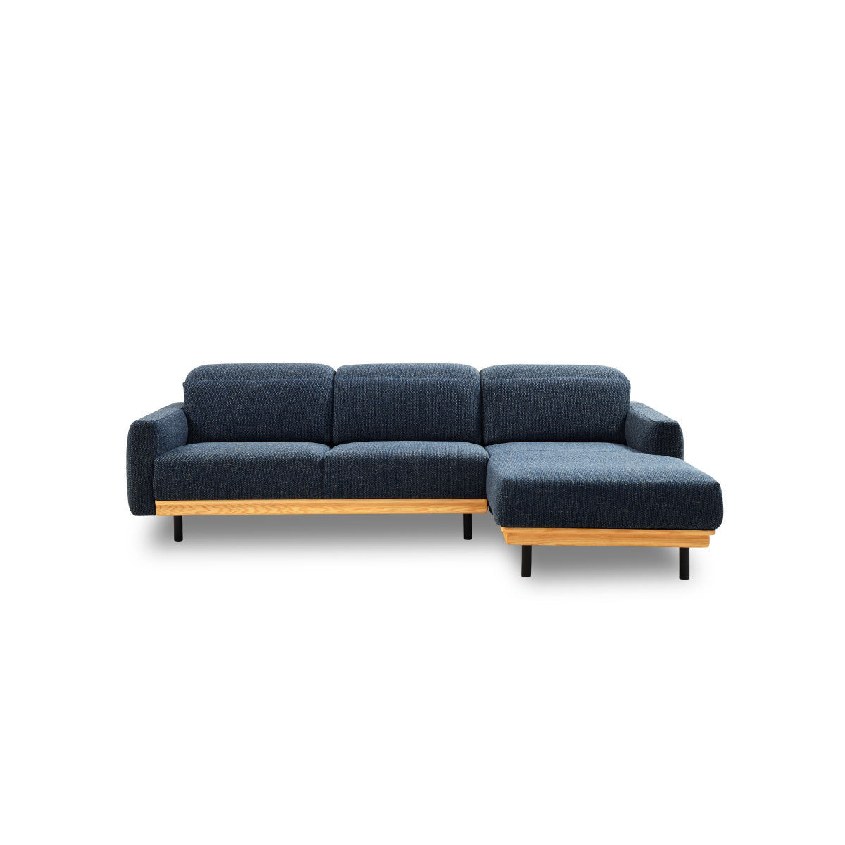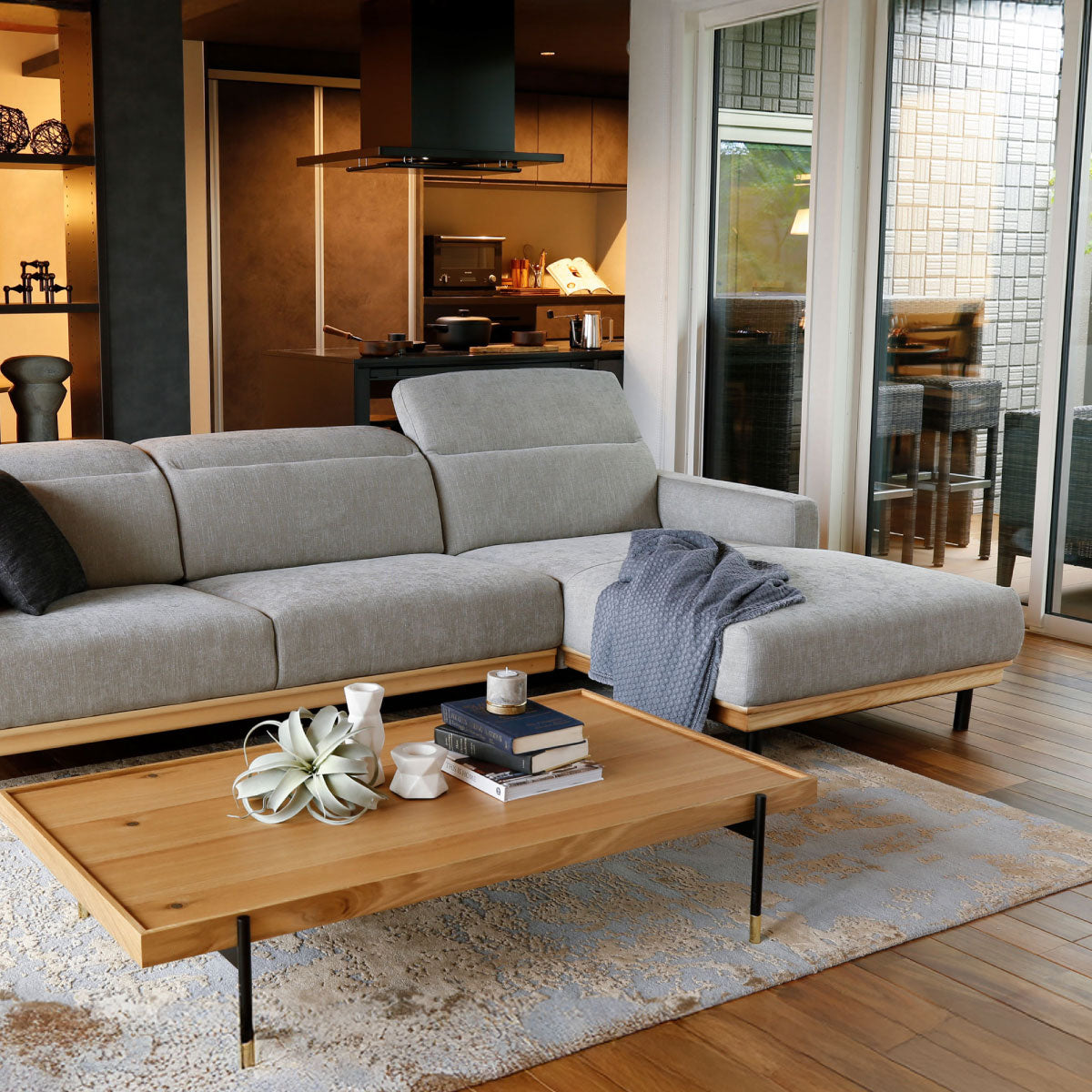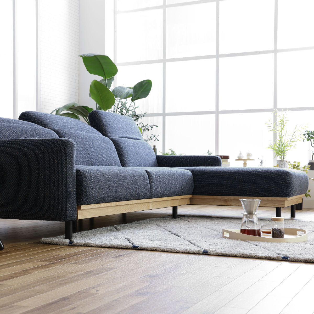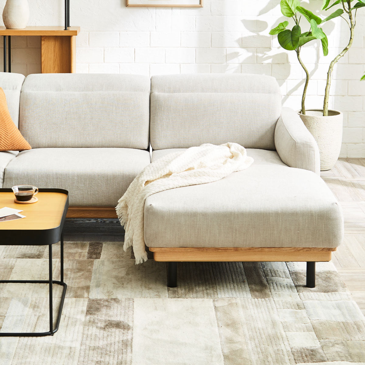 モダンデザインでありながら、脚元に木材を使用しカジュアルな雰囲気も併せ持つカウチソファ。