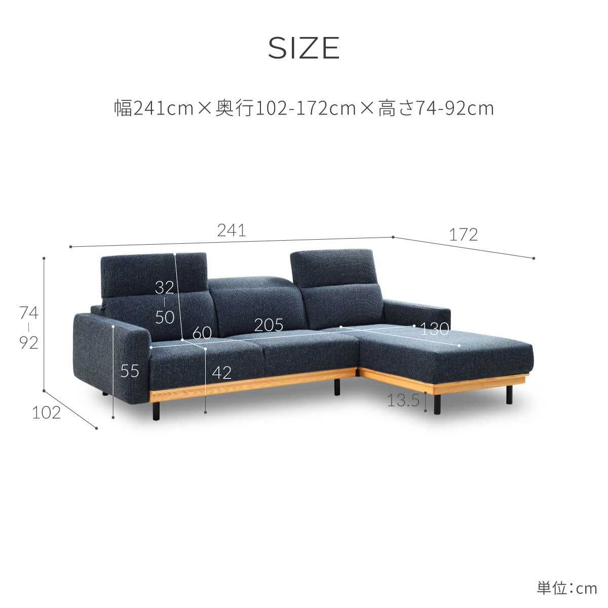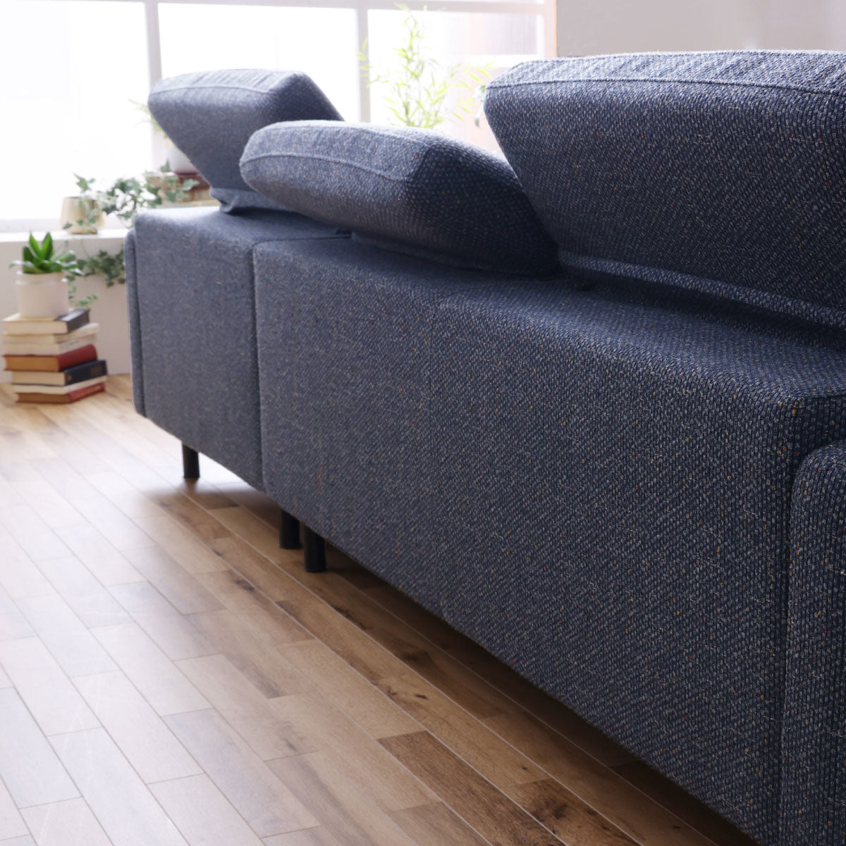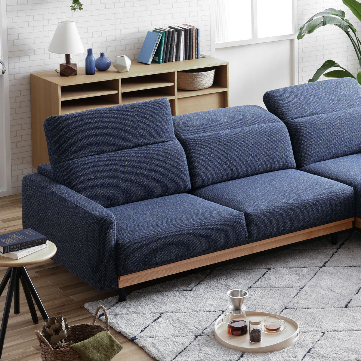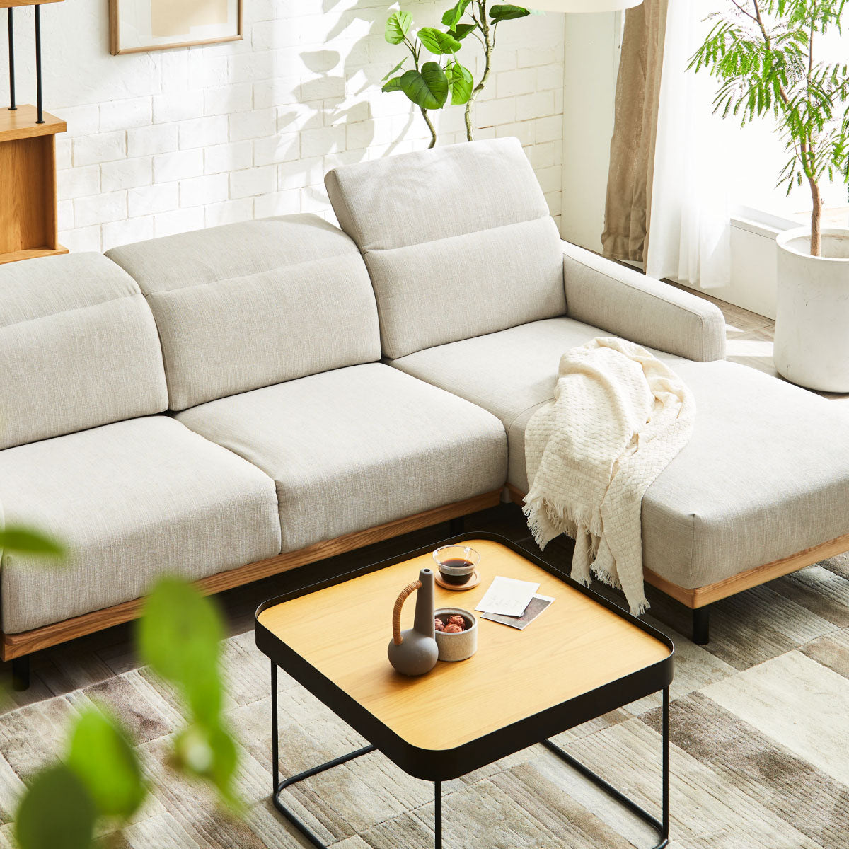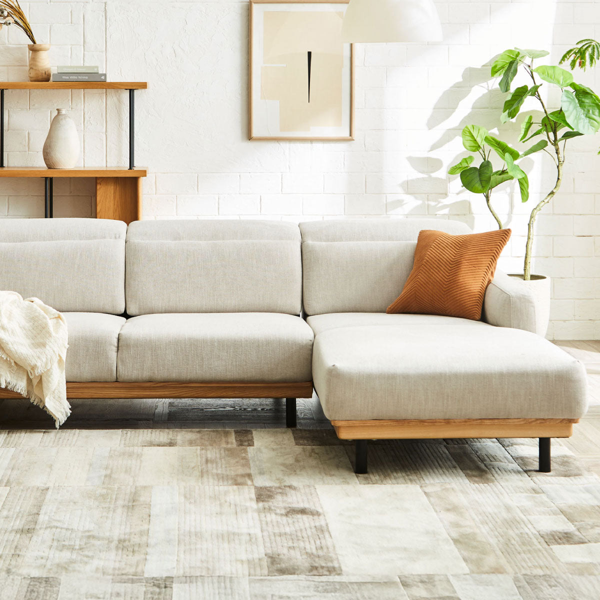 モダンデザインでありながら、脚元に木材を使用しカジュアルな雰囲気も併せ持つカウチソファ。