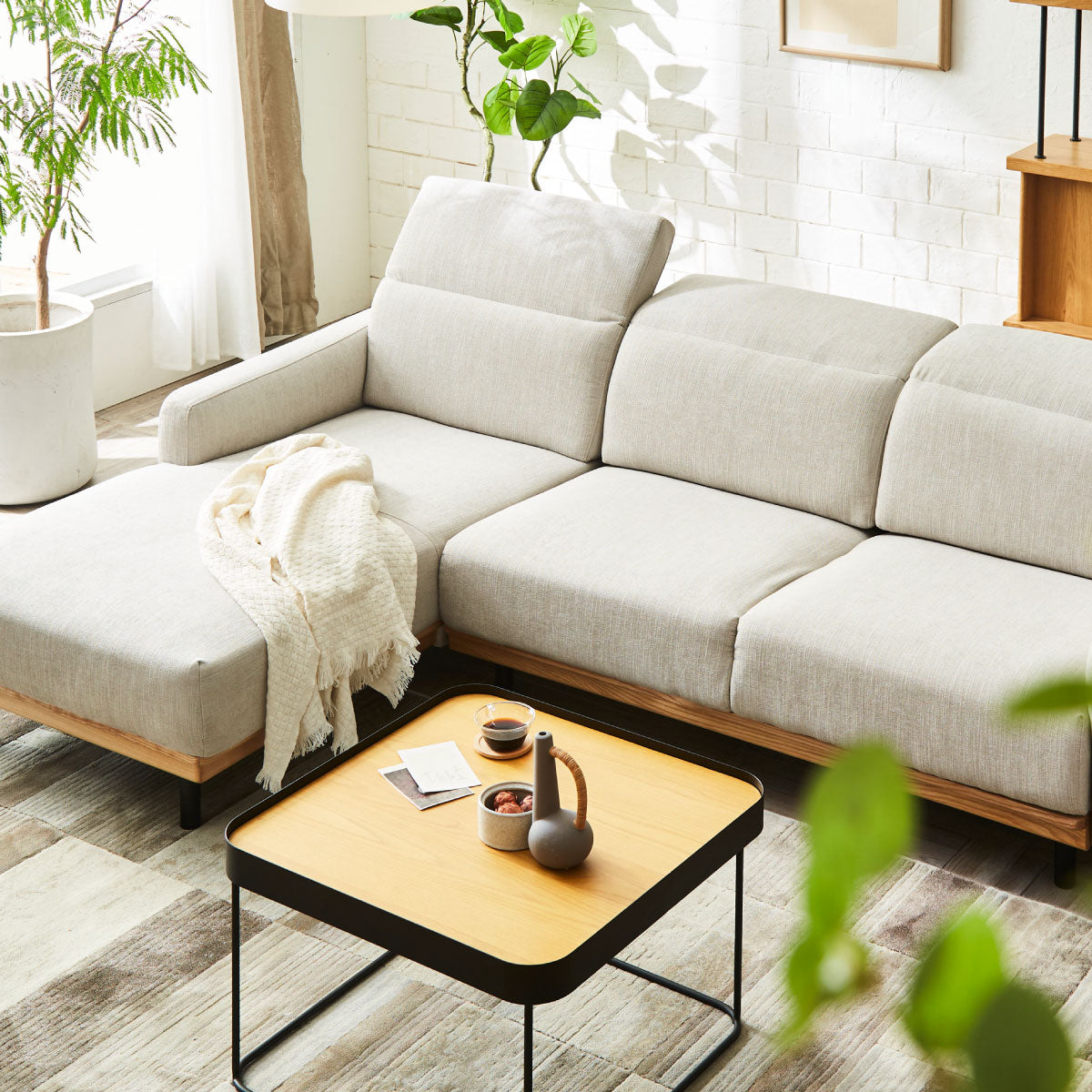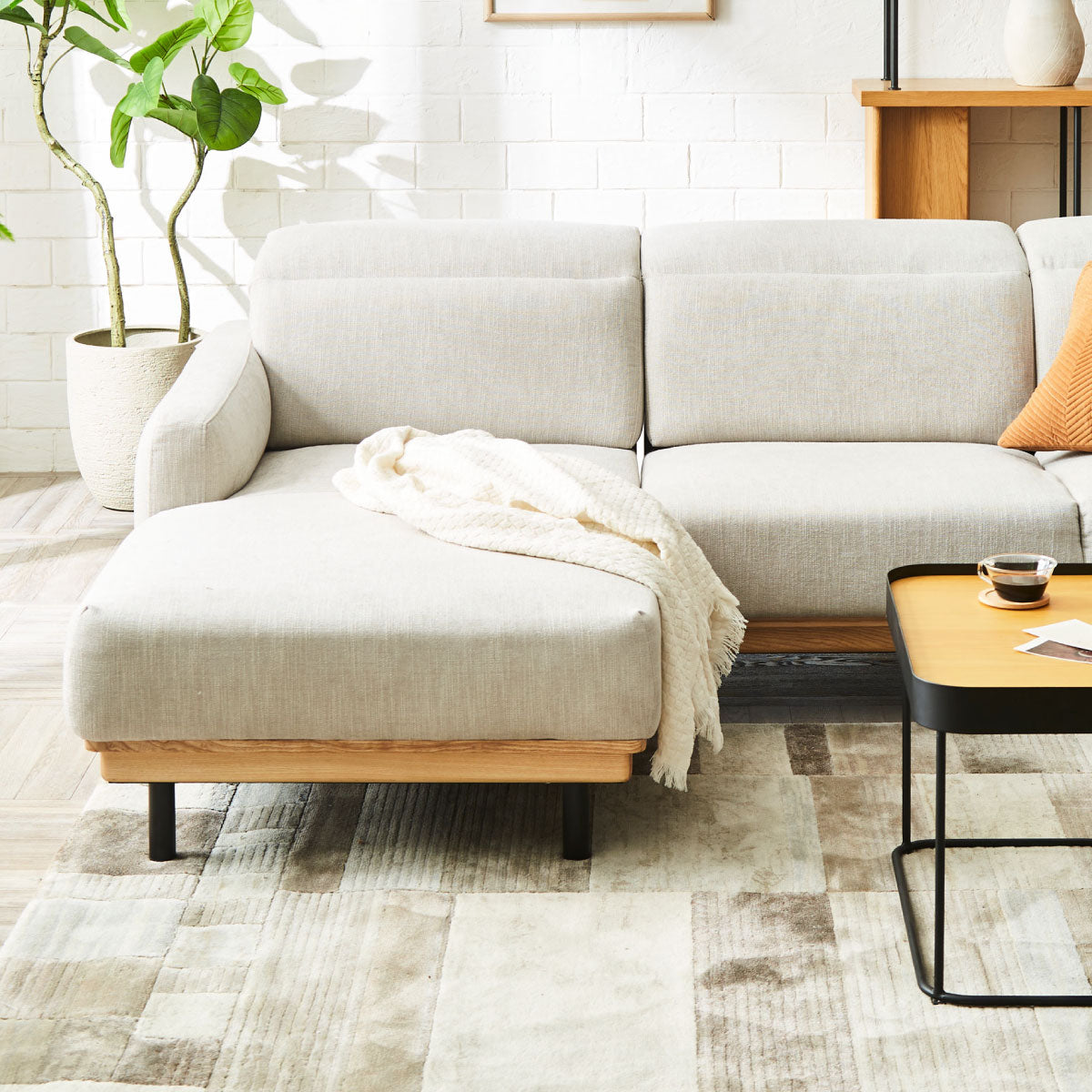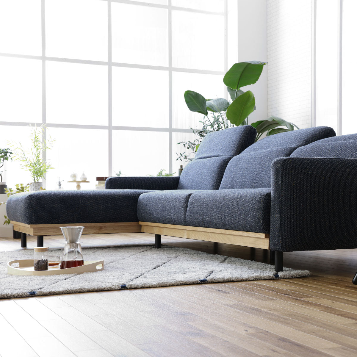 モダンデザインでありながら、脚元に木材を使用しカジュアルな雰囲気も併せ持つカウチソファ